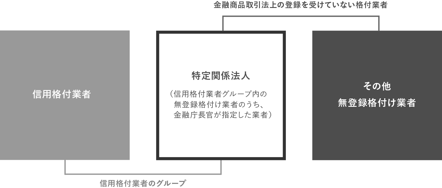 金融商品取引業者等は、金融商品取引法により、信用格付業者以外の信用格付業を行う者の付与した信用格付を利用して勧誘を行う場合には、当該信用格付を付与した者が同法第六十六条の二十七の登録を受けていない者である旨及び登録の意義等を顧客に告げなければならないこととされています。